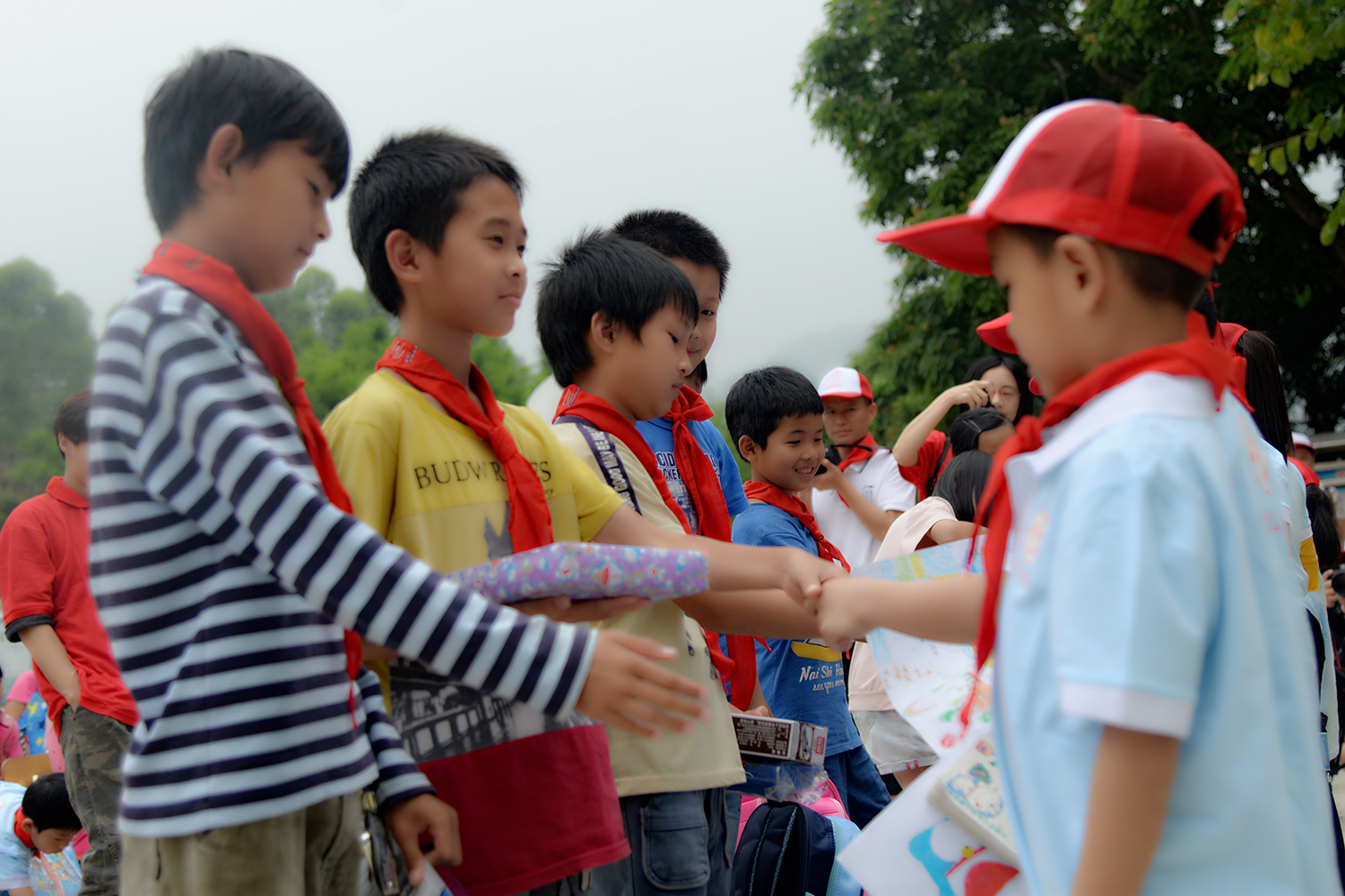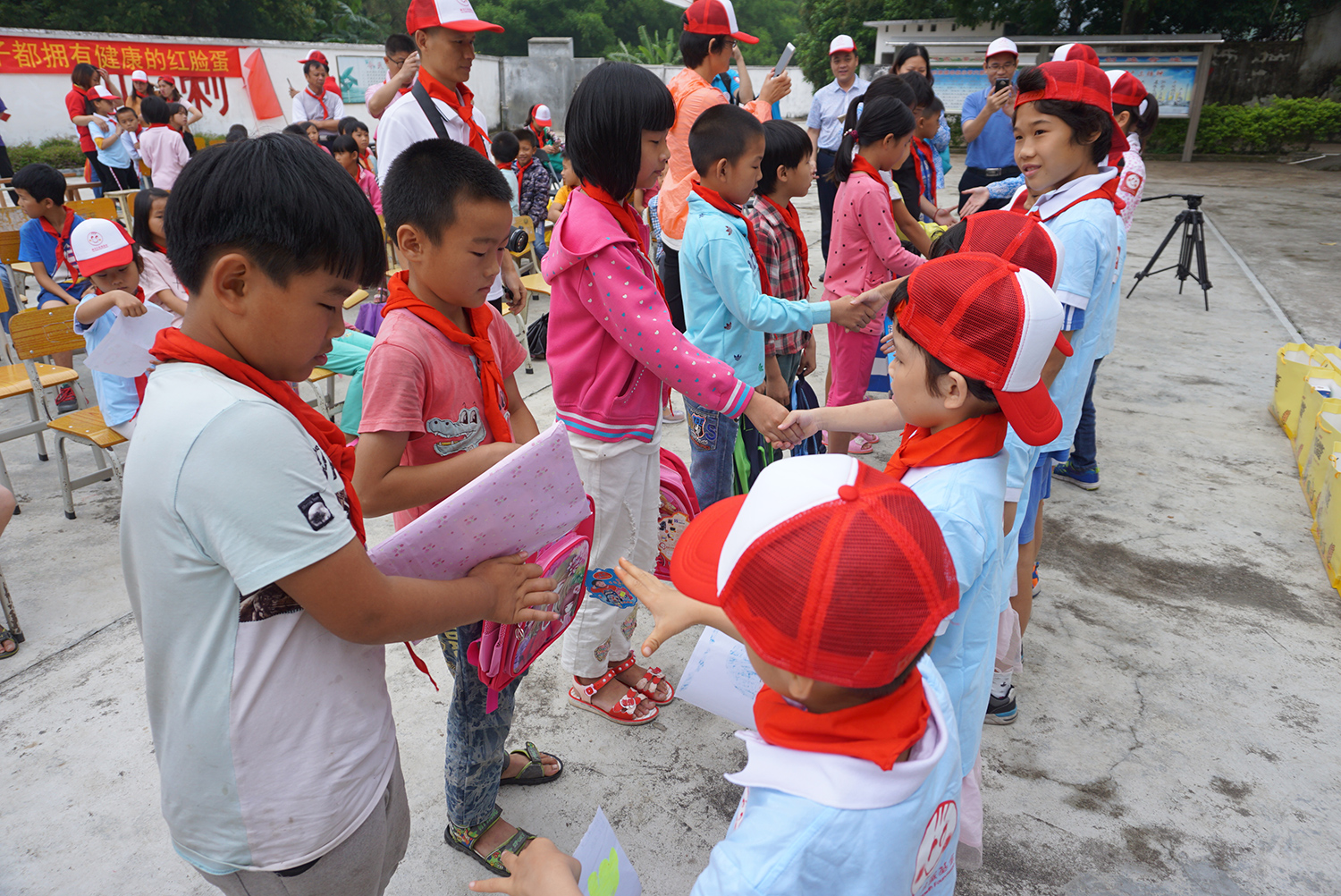 学校学生为远道而来的小客人戴上红领巾,并相互握手问好。