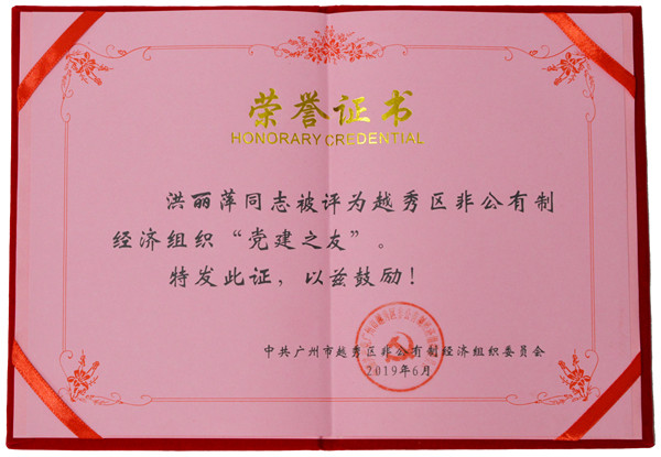 为树立典型,弘扬先进,进一步推进非公有制经济组织健康发展,推进非公有制经济组织党建工作,在纪念中国共产党成立98周年之际,广州市越秀区非公有制经济组织党委在非公有制经济组织中开展“党建之友”评选活动,yl6776永利集团副董事长兼副总裁洪丽萍同志荣获越秀区非公有制经济组织“党建之友”荣誉称号。