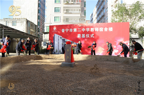 上午8时40分,教师宿舍楼工程奠基仪式开始,参加仪式的主礼嘉宾为奠基石培土壮基。