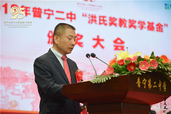 在随后进行的“洪氏奖教奖学基金”颁奖仪式上,洪江游先生发表了《 兴趣是最好的老师》的讲话,他提到,一个学生,不仅需要课内知识使自己充实,同时也需要涉猎多种课外知识培养多种兴趣爱好使自己的灵魂丰裕。他还表示,自己设立奖教奖学基金,就是为了鼓励老师多层次多方位引导学生,培养出综合能力强的学生。希望学生们再接再励,让自己的未来更精彩绝伦。母校成立九十五年来,培养的人才不计其数,如今校友们都实践着毕业时的铮铮誓言,身为“二中人”,大家要以母校为荣,奉献自己的一份微薄之力,凝聚力量。