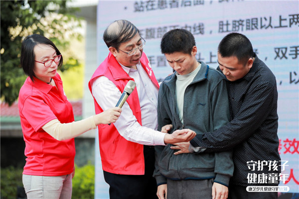 其中,结合当前儿童常见意外情况,丘教授着重给现场孩子家长讲解了如何正确应对儿童气道异物梗阻状况。为了让现场听众更直观地了解“海姆立克”急救手法,丘教授使用了仿真婴儿进行现场教学,此外,还邀请了两名家长上台进行真人示范,确保孩子及家长实际掌握到该急救手法。