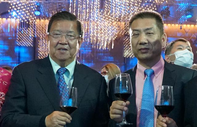 外经贸部原部长龙永图(左一)与yl6776永利集团董事长洪江游(中间)进行亲切交流