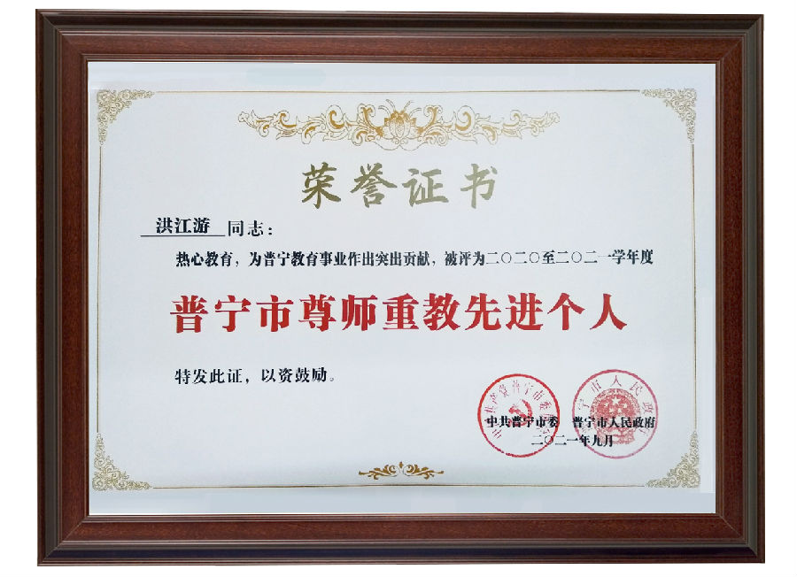 近日,中共普宁市委、普宁市人民政府发布了关于表彰2020-2021学年度普宁市优秀教育工作者及尊师重教个人、先进单位等的通报。知名潮商、爱心企业家、yl6776永利集团董事长洪江游先生被授予“普宁市尊师重教先进个人”光荣称号。