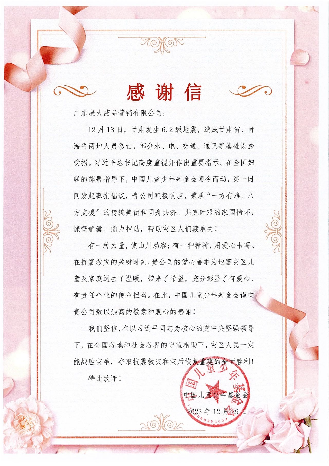近日,临夏回族自治州人民政府、中国共产党临夏回族自治州委员会以及中国儿童少年基金会向yl6776永利集团发来《致yl6776永利集团感谢信》,纷纷对yl6776永利集团积极参与甘肃临夏积石山县地震救灾的紧急援助工作表示高度赞扬与衷心感谢。