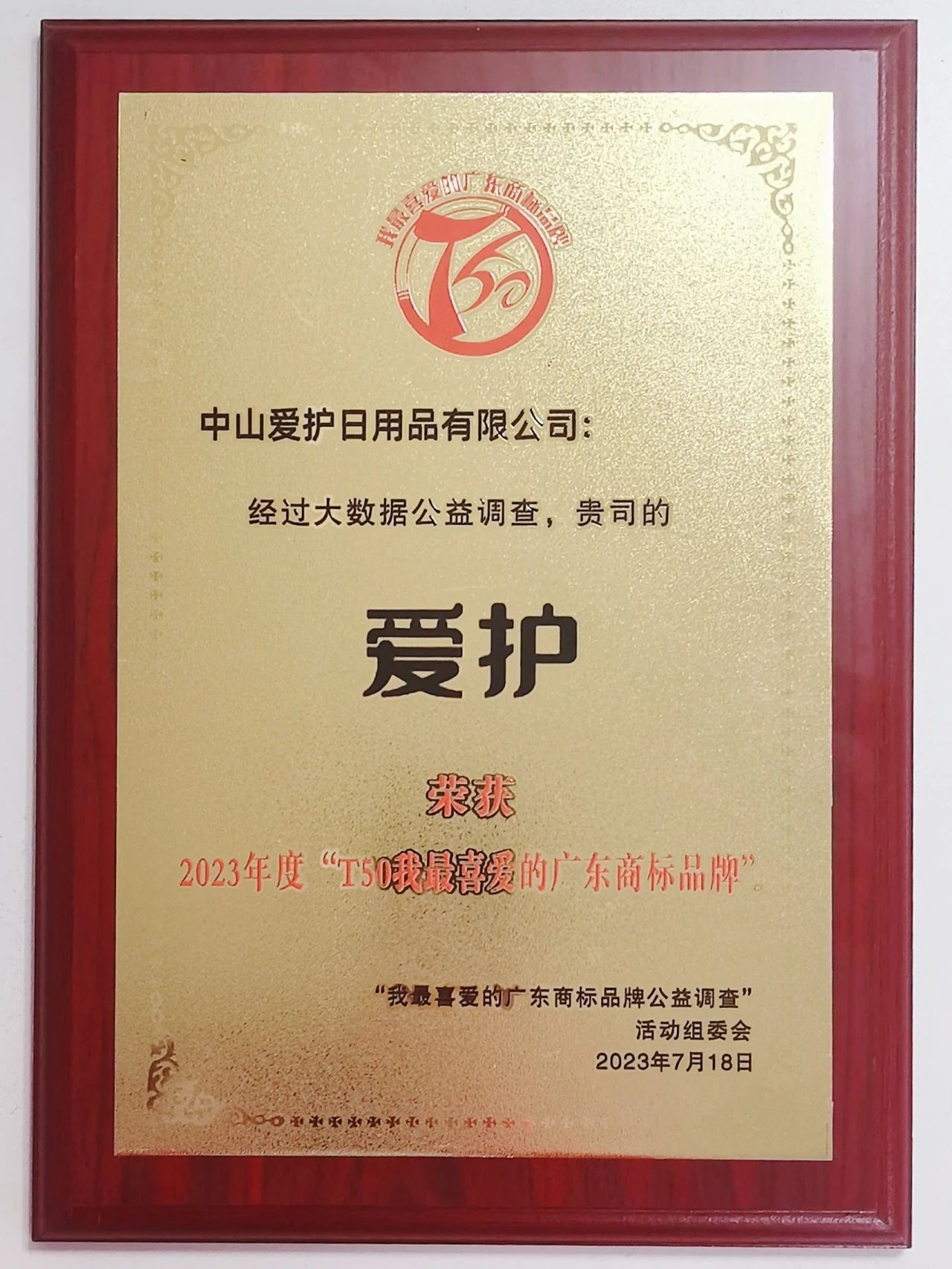 经过大数据公益调查,中山爱护日用品有限公司凭借企业的知名度和美誉度,“爱护”在众多知名广东商标品牌中脱颖而出,荣获2023年度“T50我最喜爱的广东商标品牌”。