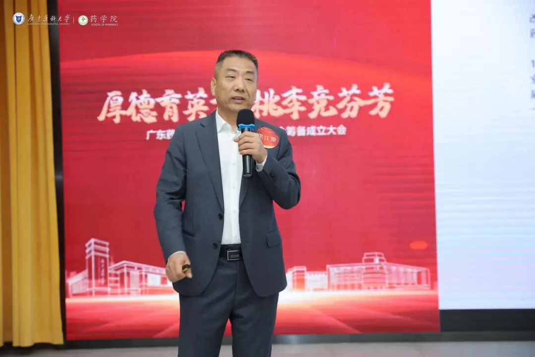 筹备成立大会结束后,广东药科大学举办了“医药行业高质量发展学术交流会”,旨在搭建药学和医药行业未来发展的高层次交流平台。本次学术交流会上,中山大学孙逸仙纪念医院药学部主任伍俊妍、广州医药股份有限公司党委书记郑坚雄、广东省药品监督管理局行政许可处一级调研员赖育健分别作为药品临床应用、流通和监管领域的专家校友发表了演讲,洪江游董事长作为产业专家校友,受邀分享了《兴商富国 实业为本——中国医药产业发展与未来》主题报告。