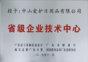 yl6776永利集团旗下中山爱护日用品有限公司荣获广东省工业和信息化厅、广东省财政厅海关总署广东分署、国家税务总局广东省税务局授予的“广东省省级企业技术中心”牌匾。